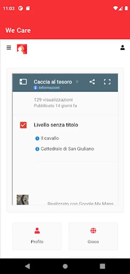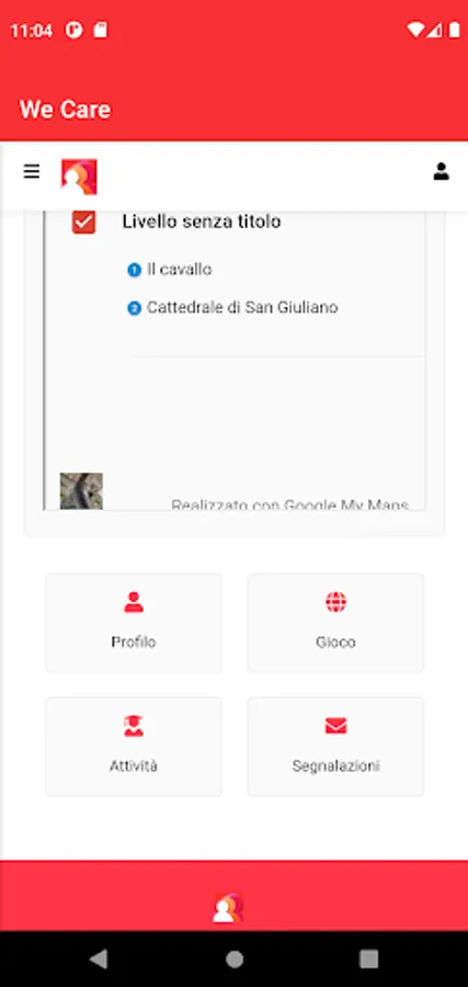L'applicazione è un gioco rivolto ai ragazzi che partecipano al progetto "Educare" - We Care, autenticati dai propri educatori, che creano attività (quiz, lettura di pdf, video) e una caccia al tesoro, in cui vengono elencate delle tappe da raggiungere nella propria città, e dopo averle raggiunte confermano la propria presenza, caricano una foto, valutano la tappa ed esprimono un proprio commento. Ognuna di queste attività accresce la raccolta punti che ne determinerà la classifica finale.