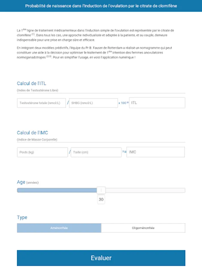 By integrating two predictive models, the team of Prof. B. Fauser Rotterdam achieved a nomogram that may be a decision support to optimize the treatment of 1st for Women anovulatory normogonadotropes (2,3). To simplify use, here are the numerical application!