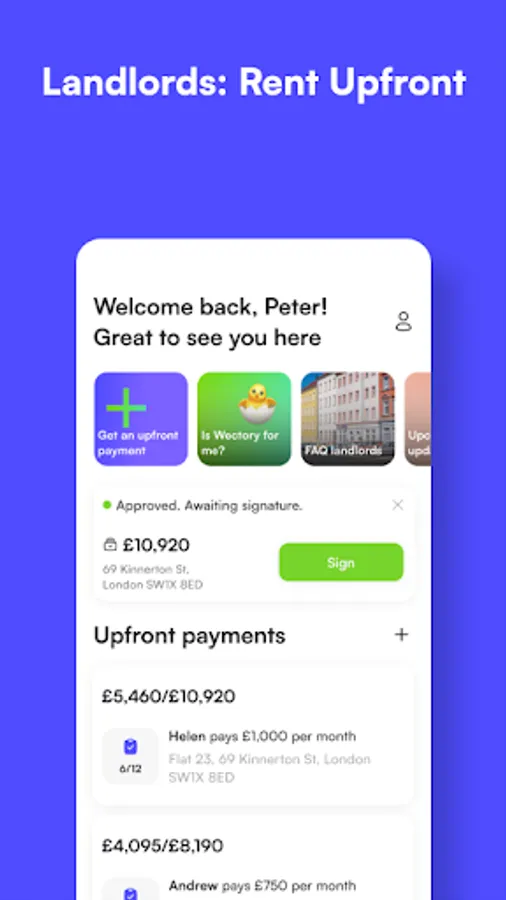 Welcome to Wectory - your end-to-end payment platform for the UK residential rental market, designed for the payment needs of both landlords and tenants. With our exclusive features like rent upfront for landlords and flexible rent payment date for tenants, we're revolutionising the rental experience by providing financial freedom, flexibility, and convenience.