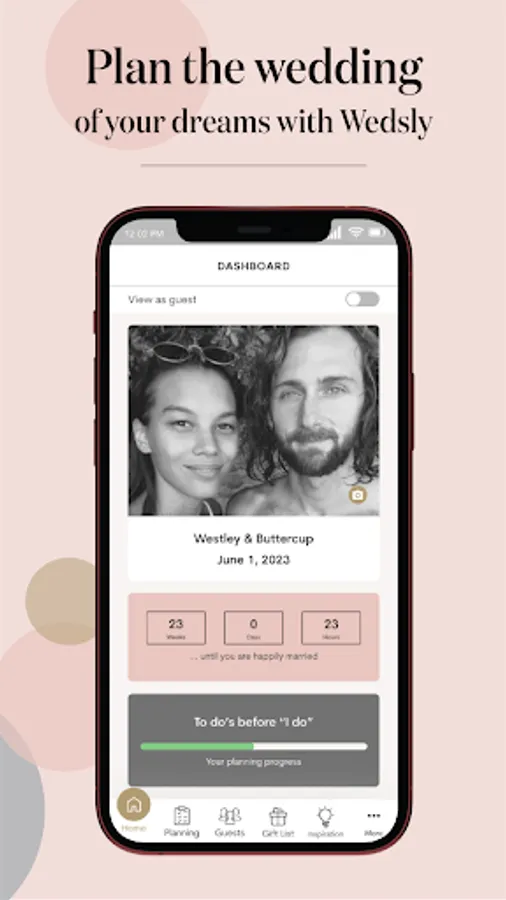 Wedsly's Wedding Planner app is your free, no-ads solution for more efficient wedding planning anytime, anywhere. And if you are a guest, then the guest view of this app is where you will find all the info you need to make this wedding the best one yet!
