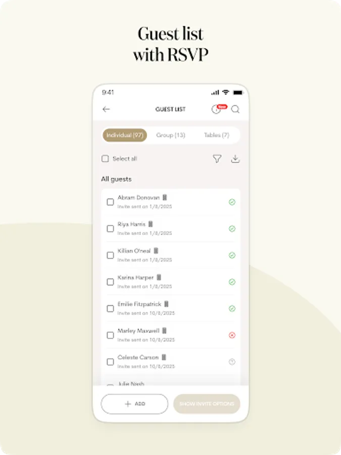 Creating and managing your guest list has never been easier! Wedsly's Wedding Planner app streamlines the process, allowing you to organise and track your guests in one place. Add guests from your phone contacts, upload them from files, or manually input their details. Receive real-time updates on RSVPs, ensuring you are always informed about your guest count. Wedsly takes the stress out of managing your guest list, allowing you to focus on what is important to you.