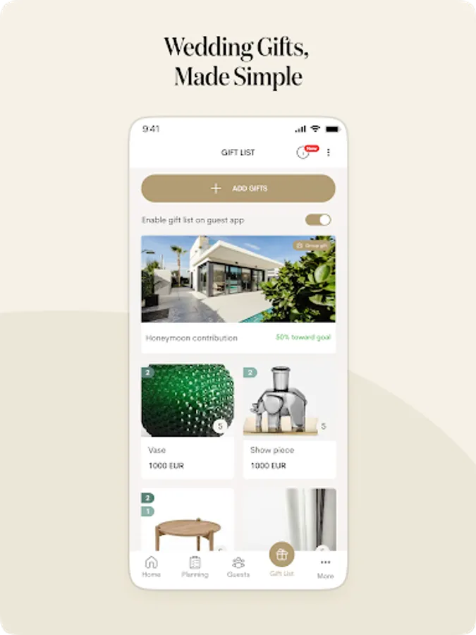 The gift-giving process is easy with Wedsly! The couple shares a curated wedding registry. They can include URLs for easy online shopping, directing you to specific items. With this tool, as a guest, you will clearly understand what the couple would love to receive, making the gift selection process stress-free. Wedsly's gift list feature ensures that all guests can contribute to the couple on their wedding day by selecting gifts that genuinely reflect their preferences.