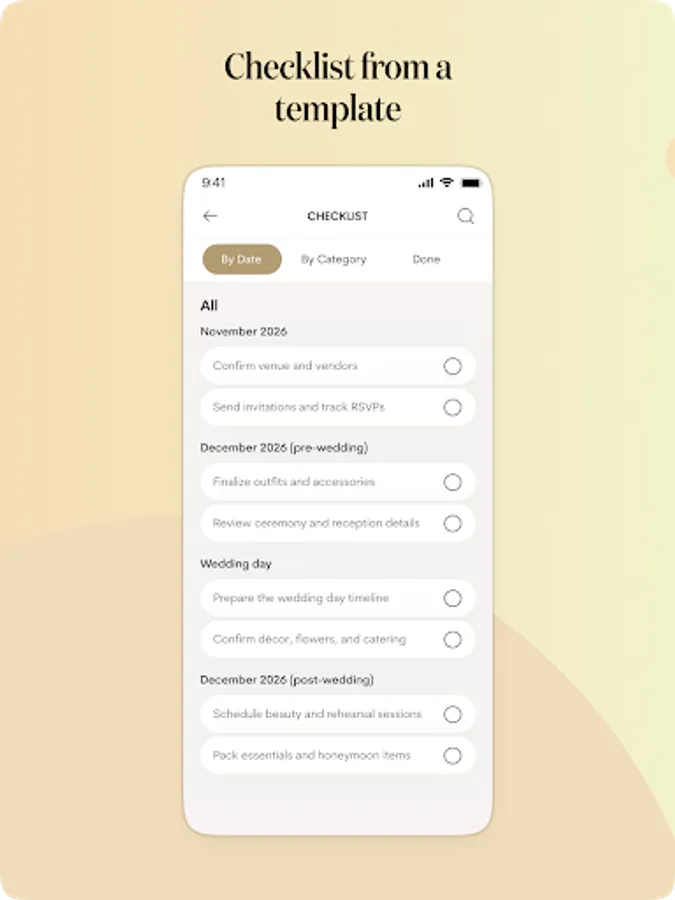 Stay organised with your wedding planning tasks with Wedsly's customisable checklist, which contains all wedding planning tasks, allowing you to keep track of every detail. Easily customise the checklist to suit your unique needs and preferences. Categorise and sort tasks, ensuring seamless progress as you move closer to the big day.