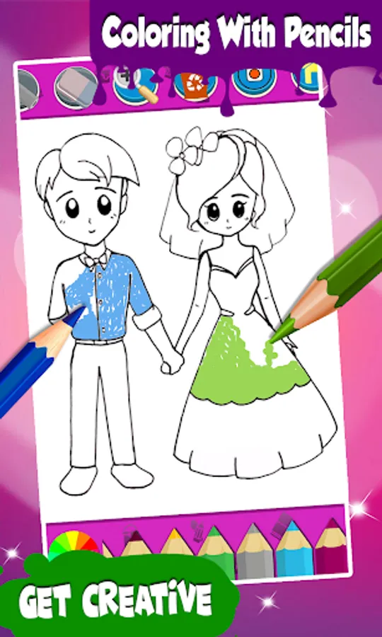 You can paint, draw or doodle whenever they want to. Doodling, painting and drawing was never so easy and funny. be creative by downloading this free app: Coloring game for girls Bride And Groom with many pictures which can be drawn, painted or doodle their . No matter where are you from in this game you are gonna find african, asian, american, european and of course australian Bride And Groom .
