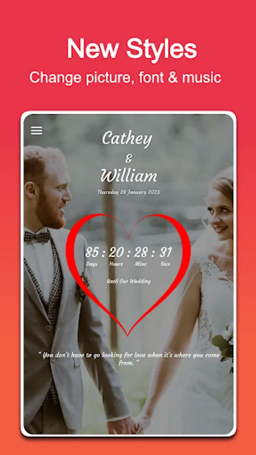 Perfectly blended background photo and song with moving animation will create a beautiful wedding countdown in the form of a movie.