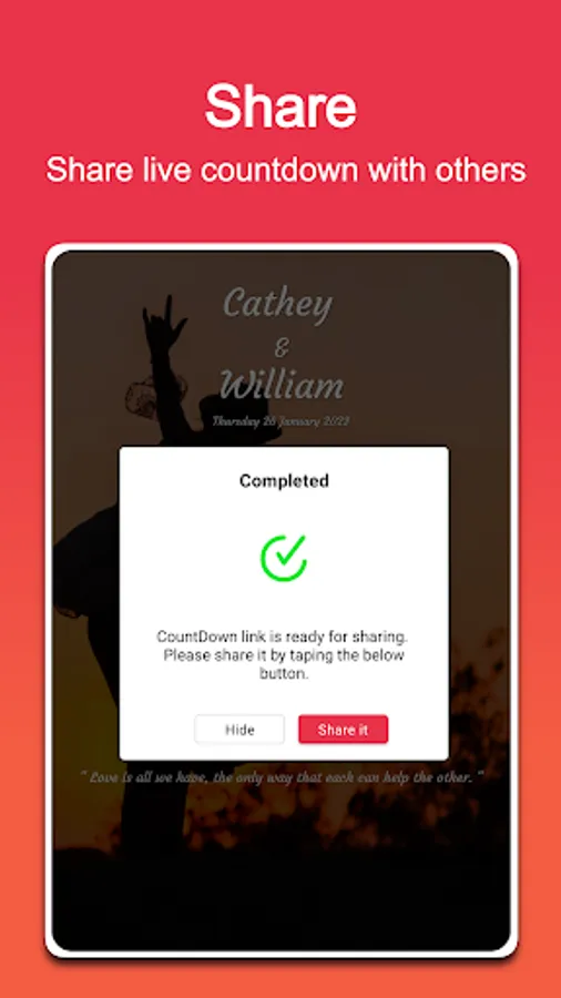 The Share to Social media feature, which works as save the date reminder for your friends and family members. Where you can share countdown screen as a photo or your personalised wedding app.