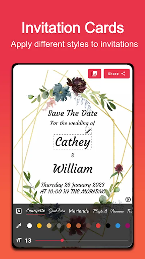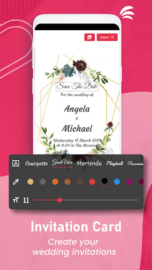 App's Wedding invitation maker helps you create your own wedding invitation in a few minutes, without having to worry about customizations and time consuming procedures.