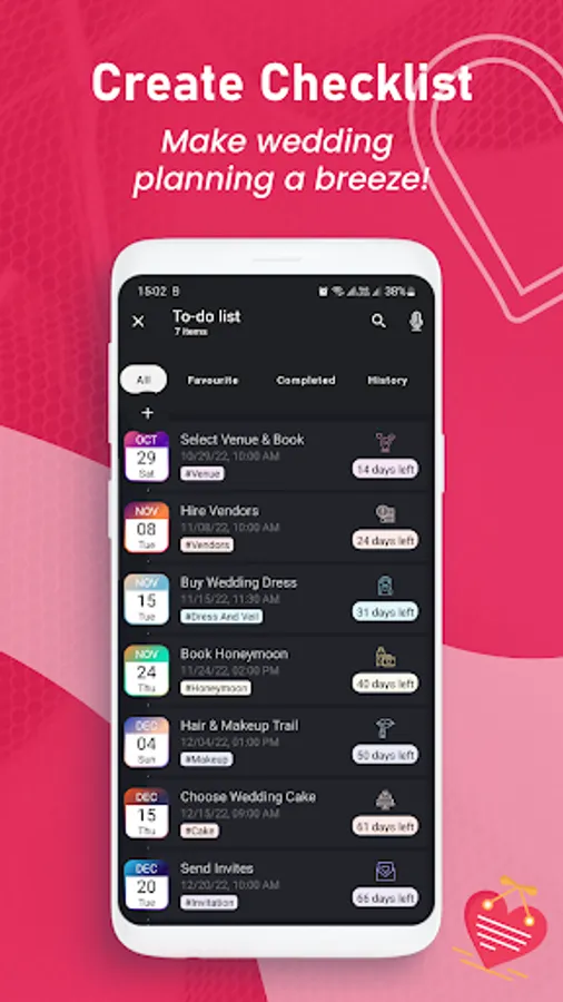 + A sleek and elegant To-Do list maker with notifications will help you to organise and plan your wedding events.