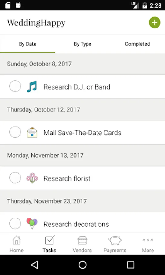 - WeddingHappy asks for your anticipated wedding date. Then we build you a customized schedule with a to-do checklist and suggested due dates. You can change any of the tasks and dates.