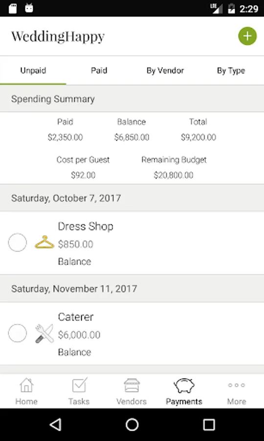 - Spending summary. Measure your spending. See how much budget you have remaining and your current cost per guest.