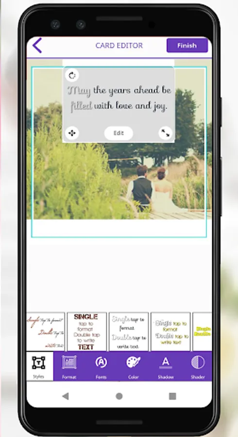 Use our wedding card designer to create and send wedding wishes with images to someone who deserves it! This birthday card maker will help you to design wedding card and write sweet wishes on them. Create and send special happy wedding greetings that will put a smile on someone's face. This Wedding Card Making App can be your today.