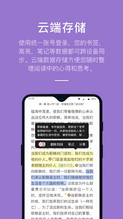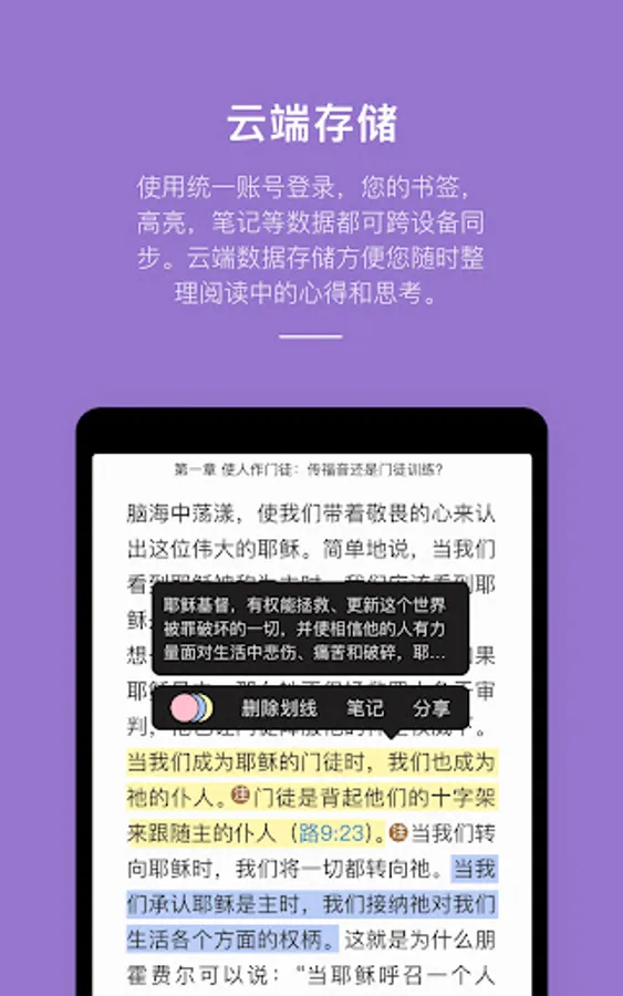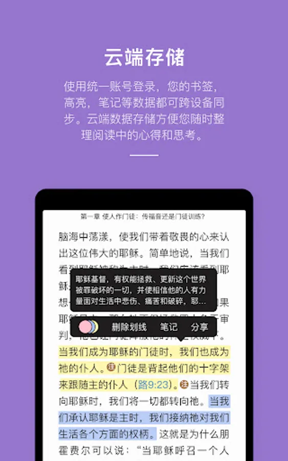 With one account, all your bookmarks, highlights, and notes can be synchronized across different devices. Cloud storage makes it easy to write down your reading thoughts anytime.