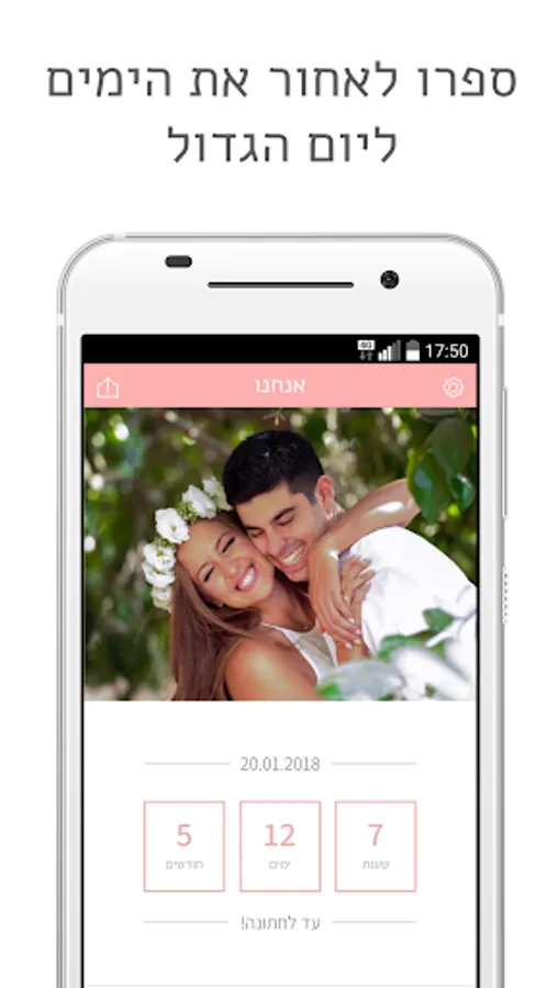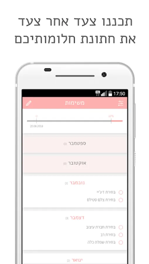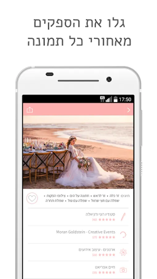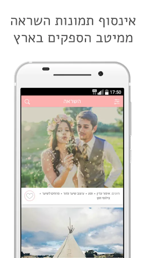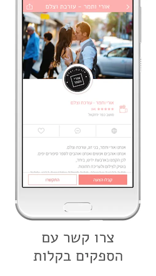 אפליקציית החתונות המושלמת למתחתנים. בואו לשאוב השראה ולמצוא את מיטב הספקים המובילים בתחומם בישראל והכל במקום אחד, בלחיצת כפתור, כל מה שצריך לתכנון הארוע המושלם.