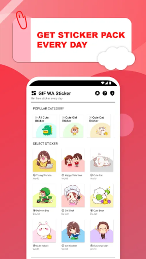 Mobile sticker application for WAStickerApps. There are 100,000+ motion stickers that are updated every day and are ready to be added to express your situation while chatting. There are cute girl stickers , cute cat stickers for you cat lovers, cute rabbit stickers , cute bear stickers , and cute couple sticker for those of you who are in pairs. This WAStickerApps is 100% free with HD image quality.