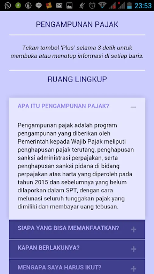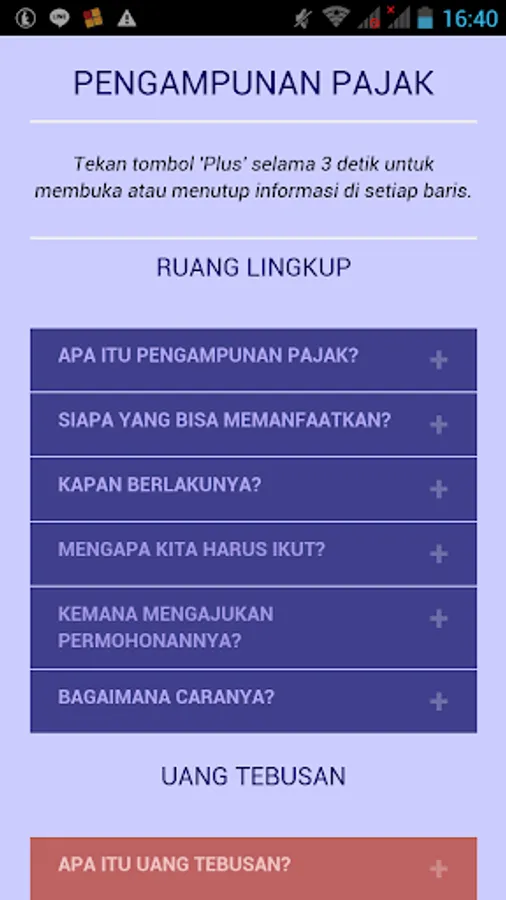 Aplikasi 'Tax-Amnesty' merupakan Pedoman Digital atau Buku Saku Digital tentang Pengampunan Pajak yang dibuat untuk membantu Wajib Pajak mengenal, mengetahui, memahami, dan memanfaatkan program Pengampunan Pajak sesuai dengan prosedur atau tata cara yang diatur dalam Undang-Undang tentang Pengampunan Pajak. Selain itu, aplikasi ini juga bisa menjadi pedoman untuk siapa saja, baik Petugas Pajak, Wajib Pajak sendiri, Konsultan Pajak, maupun Kalangan Akademisi dalam menjalankan, mengawasi, dan mensukseskan program Pengampunan Pajak.