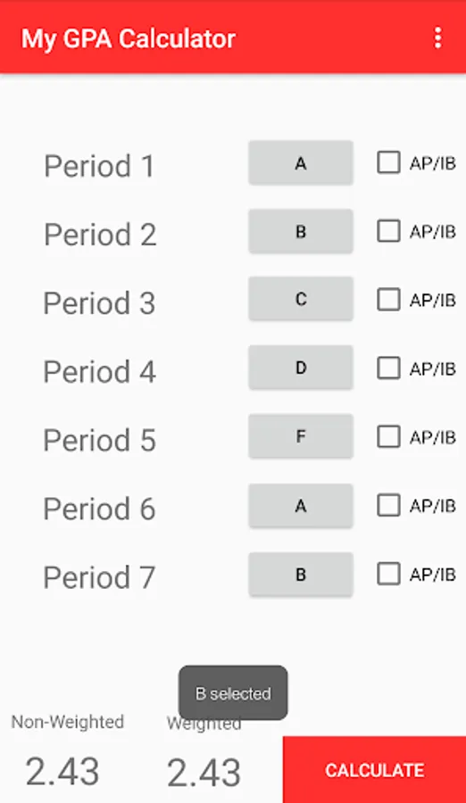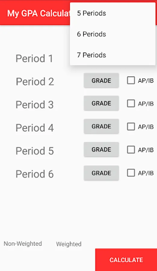 High school section calculates GPA with 5, 6, or 7 classes on a 4.0 scale, both weighted and unweighted. A "D" grade for AP courses counts as zero points because of the "No D policy" in Advanced Placement.
