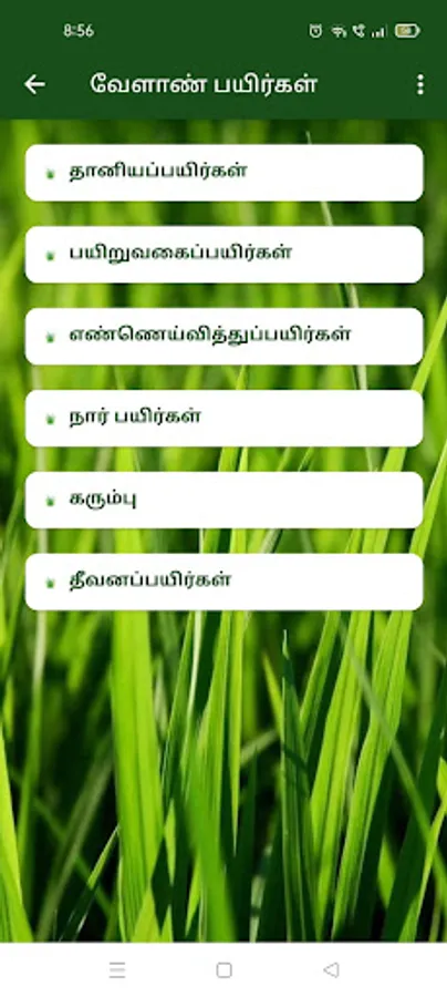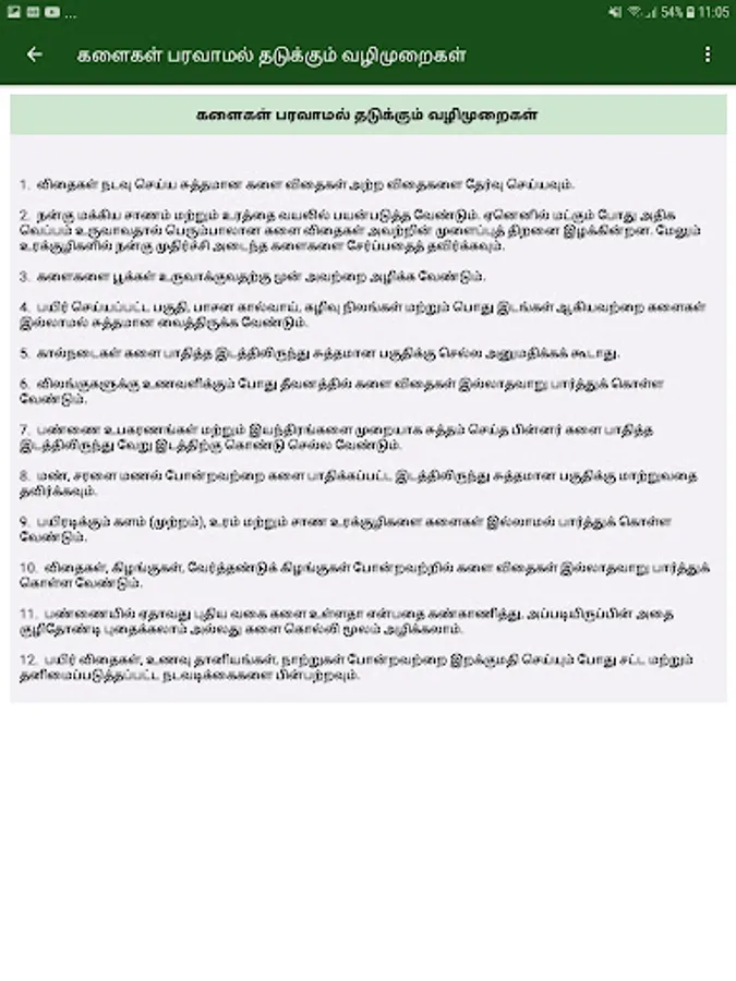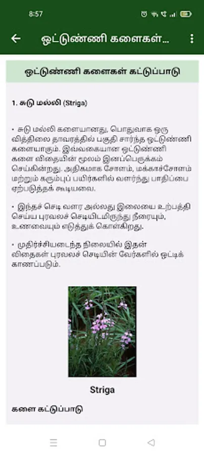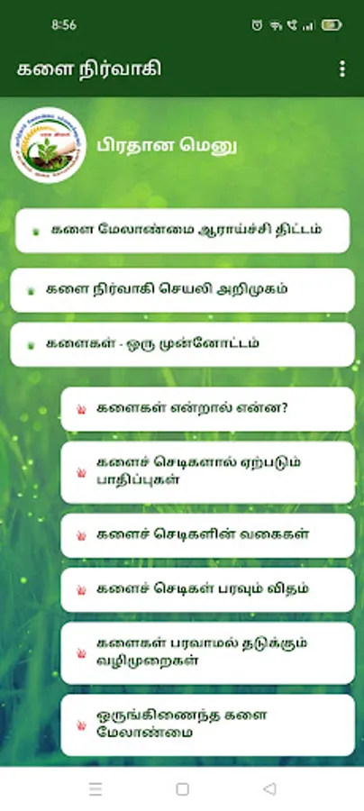 • இதில் வேளாண் மற்றும் தோட்டக்கலை பயிர்கள் என இரு வகைப்படுத்தப்பட்டுள்ளது. அதைத் தேர்வு செய்து ஒவ்வொரு பயிருக்கும் தனித்தனியாக களை மேலாண்மை முறைகளை அறிந்து கொள்ளலாம்.
