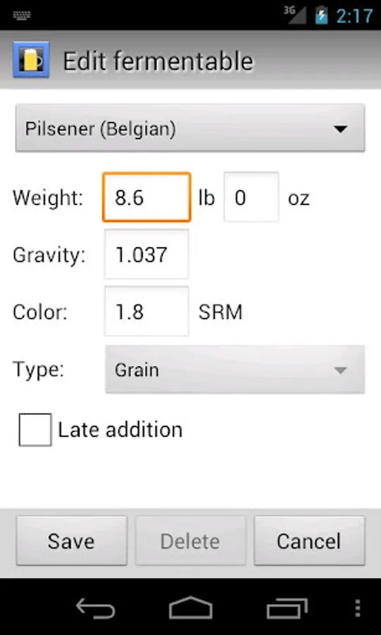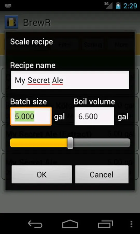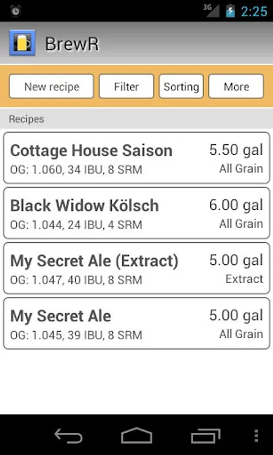* Adjustable per recipe: brewhouse efficiency, batch size, boil volume, recipe type (extract, partial mash or all grain)