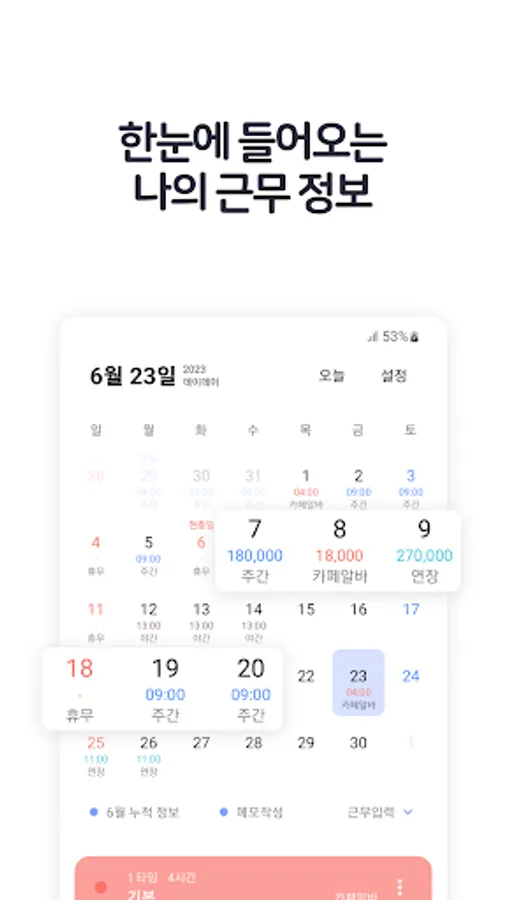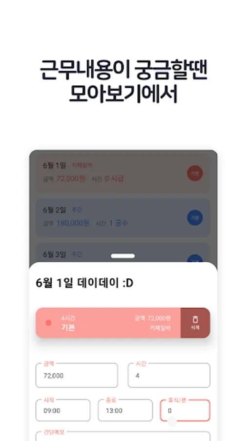 It is possible to store and manage work hours, hourly wages, monthly wages, etc. without signing up and logging in, and real-time synchronization of work information and community use are possible through an Internet connection and login. Start managing your payroll with a more convenient and neat design using Dayday.