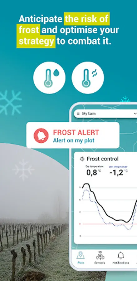 • Receive alerts (by email, SMS, phone calls or notifications) to be warned in case of climatic variation on your plot.