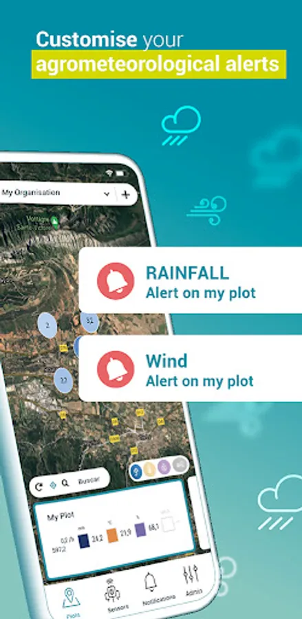 • Create your tailor-made alerts from a wide selection of agro-meteorological parameters: cumulative rain, frost, humidity, wind, etc.