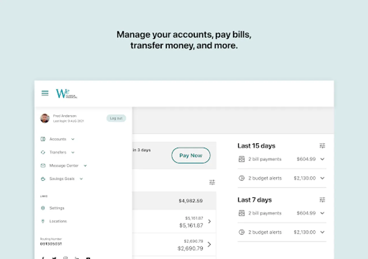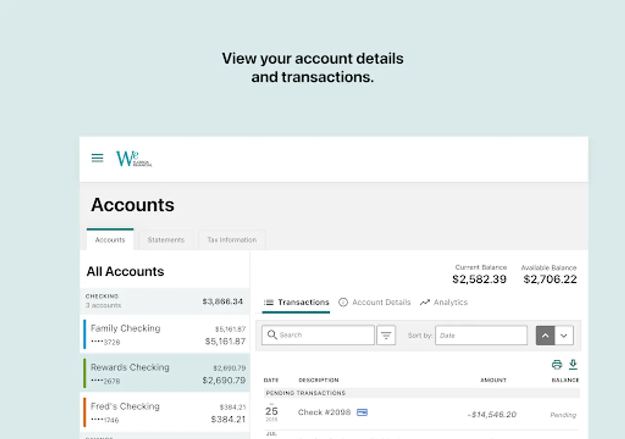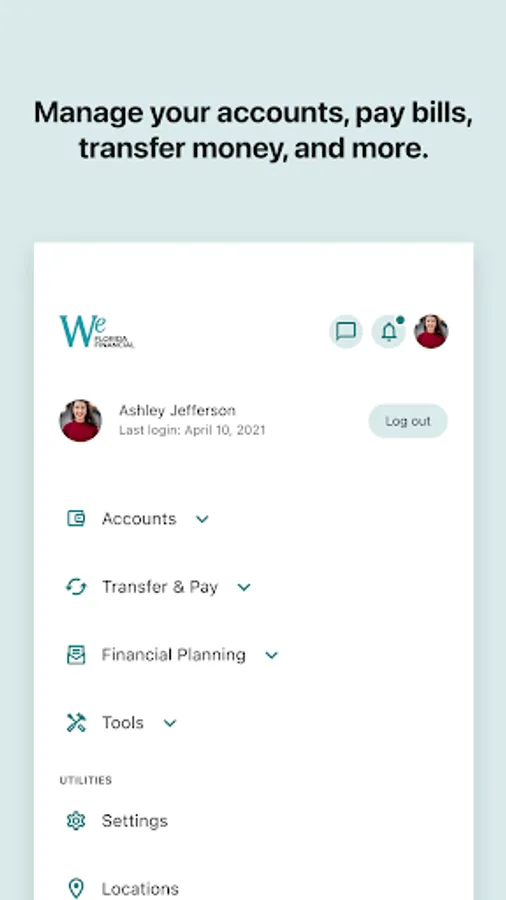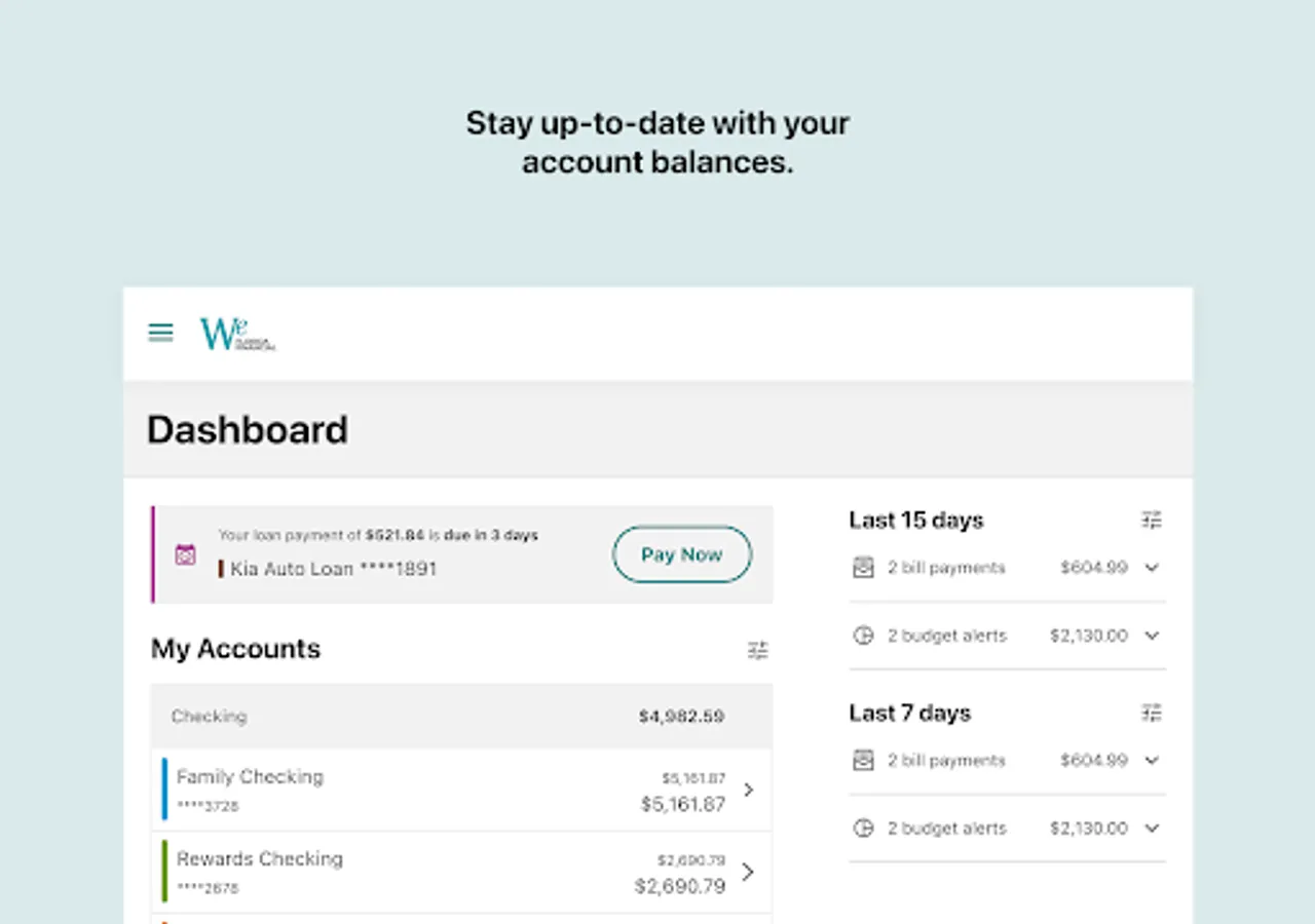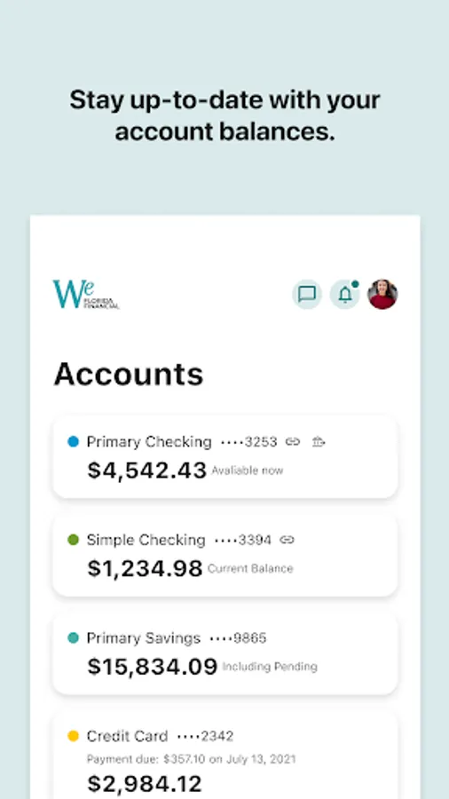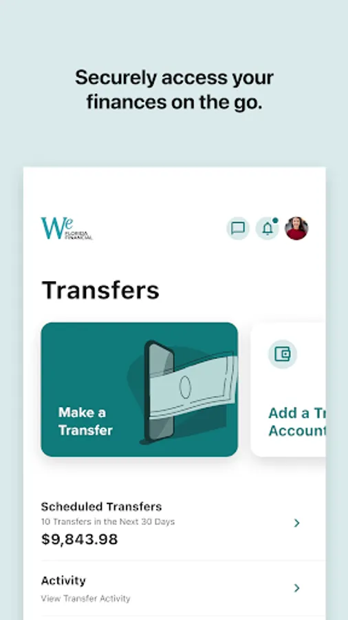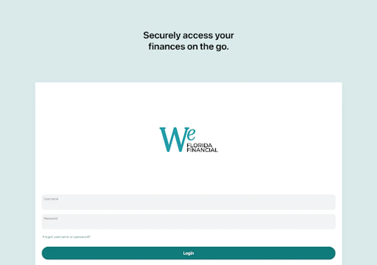 Stay connected to your money with the We Florida Financial mobile app. View your account balances, check your transaction history, transfer money between accounts, pay bills, deposit checks (mobile deposit access is subject to approval), pay your We Florida Financial loan, locate nearby branches, and track your personal budget and savings goals. See our Terms & Conditions Agreement for information on crediting of deposits. Funds availability is subject to We Florida Financial’s Funds Availability Disclosure. Federally insured by NCUA. Equal Housing Opportunity.
