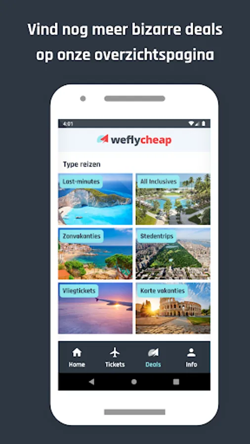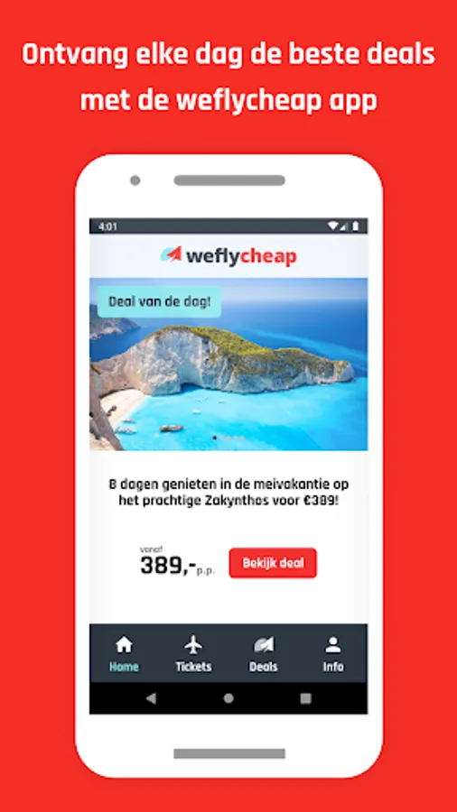Receive the very best WeFlyCheap deal every day in our app. Don't you want to miss this? Then turn on the push notifications. In addition, you can find your airline tickets super fast via a handy map view in the app. Looking for a specific destination, accommodation or type of trip? No problem. Your vacation is easily found via our app!