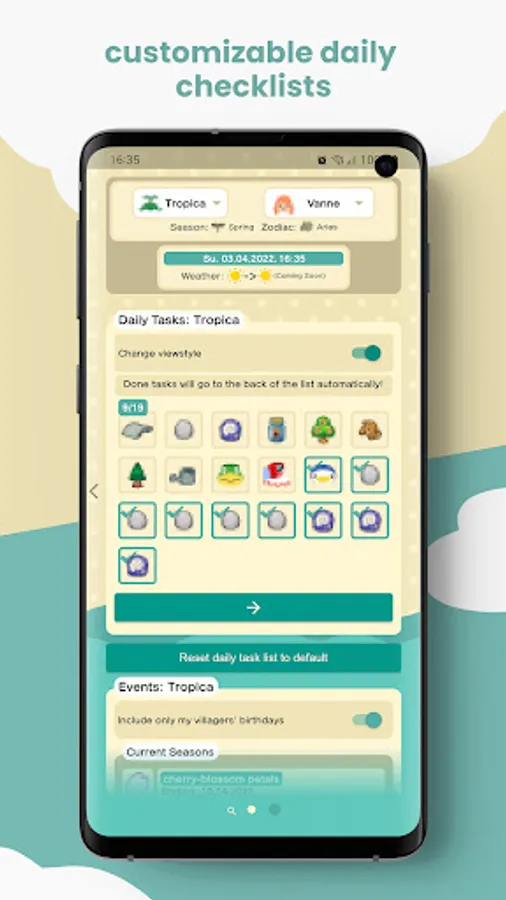 - Dashboard with customizable daily todo list, current seasons and events showing, active critter tracking and island visitor tracking