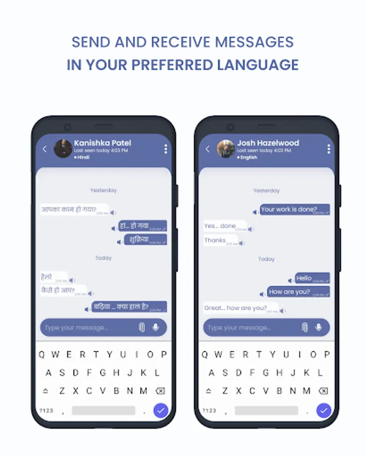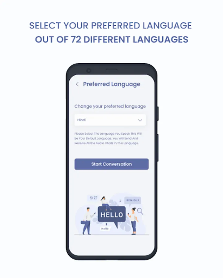 In this app, the users will have the facility to send and receive messages in their preferred languages. For example, if a user1 chooses “Hindi” as the preferred language and user2 selects “English” as the preferred language, when the user1 with “Hindi” as the preferred language sends a text or audio message in “Hindi” to user2 with “English” as the preferred language, the message will get translated from “Hindi” to “English” and the user2 will get the translated text or audio message which will be in English and if the user2 will send a text or audio message in “English” it will get translated in “Hindi”. The application supports 72 languages (out of which 19 are India languages and rest are all international languages) for text and audio.
