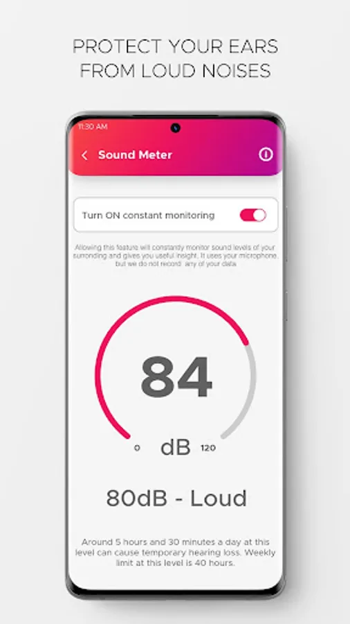 Allow constant monitoring and get benefits of realtime noise assistant. (This uses the microphone in the background for 2 seconds each minute just to measure noise each minute). Each minute's data is also used for the PHI Calculation. Importantly it notifies you when your ears are exposed to loud sounds of a certain period of time.
