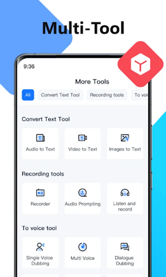 TransVoice supports Audio to Text, Smart Reading, Listen and Record, Reduce Noise, Recording Prompt, Translate Voice, Recorder, Video to Audio, Image to Audio, Web to Audio, Photo Taken to Text, Video Dubbing, Video Voice Changer, Synthesize Audio & Video, Audio Trimmer, Audio Merger, Audio Splitter, Format Converter, Pitch Shift, Crossfade, Voice Changer, Audio Compress, Audio Mix, Audio Extract, Stereo Separation, Stereo Synthesis, Audio Reverse, Video to Text and Image to Text.