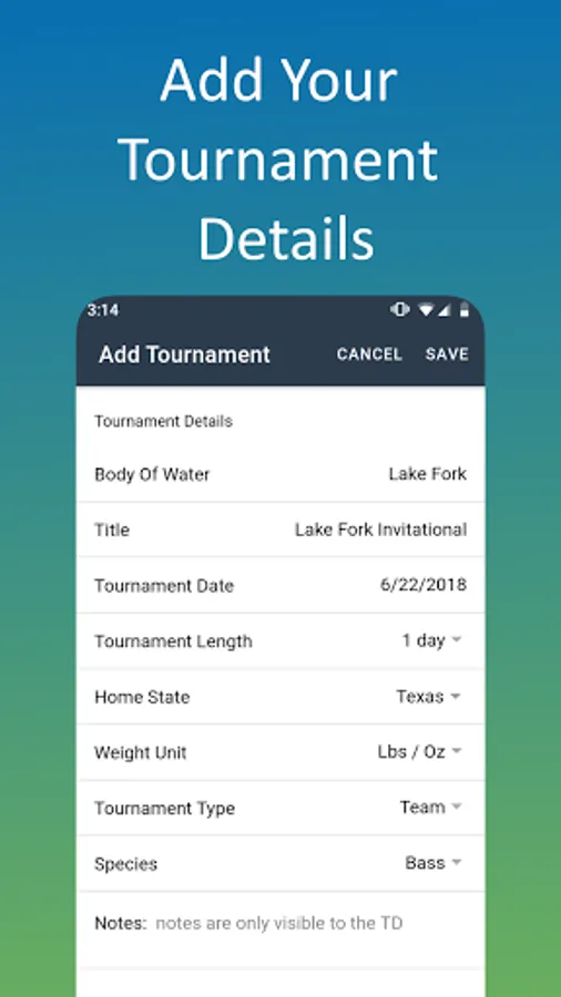 The Weighfish TD app is a fishing tournament manager for Tournament Director’s use. The Weighfish TD app allows directors to easily record and track everything you need to right at the weigh-in. No more writing by hand or using complicated payout spreadsheets is necessary. You can host your own fishing tournaments or manage your fishing club’s tournaments. This app works alongside the website where the Tournament results will be immediately visible to anyone that wants to see.
