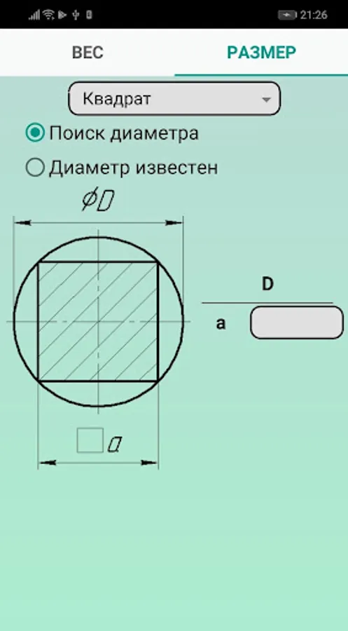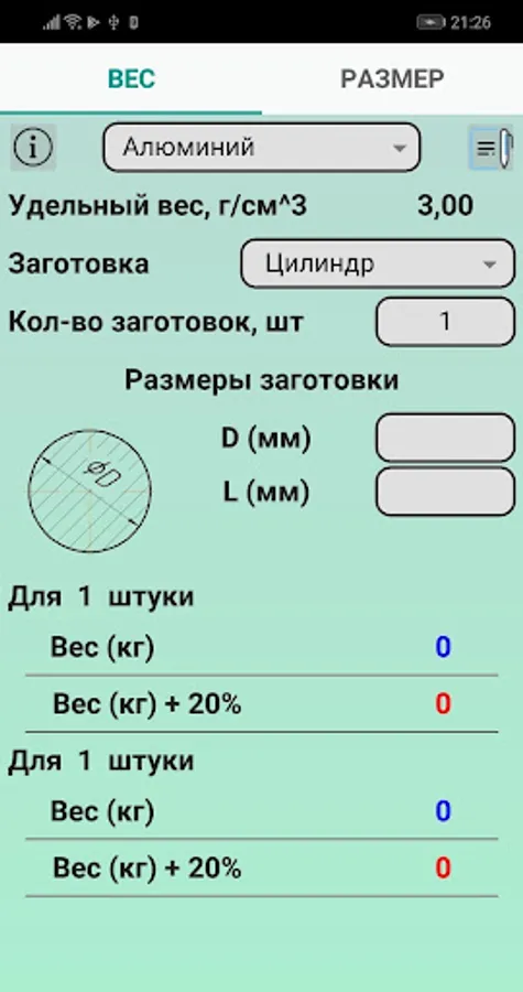 In the application, you can determine the weight of cylindrical, hexagonal and rectangular blanks from various materials. Allows you to determine the diameter of the circumscribed circle by the size of the square, rectangle and hexagon, or, knowing the diameter, determine the dimensions of the above blanks.