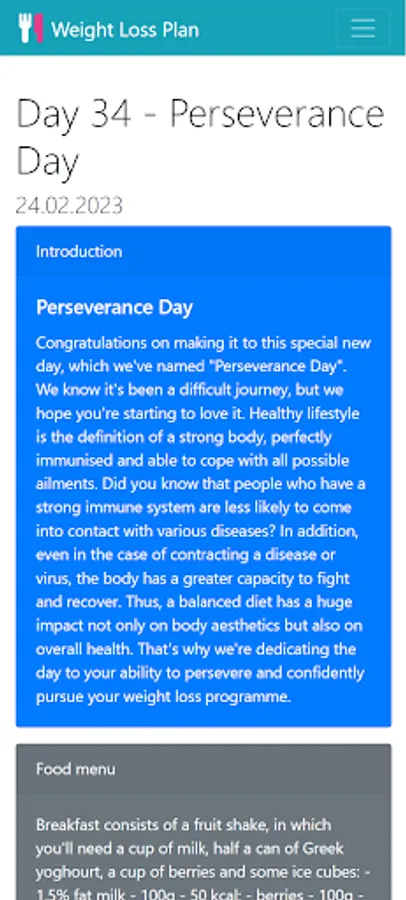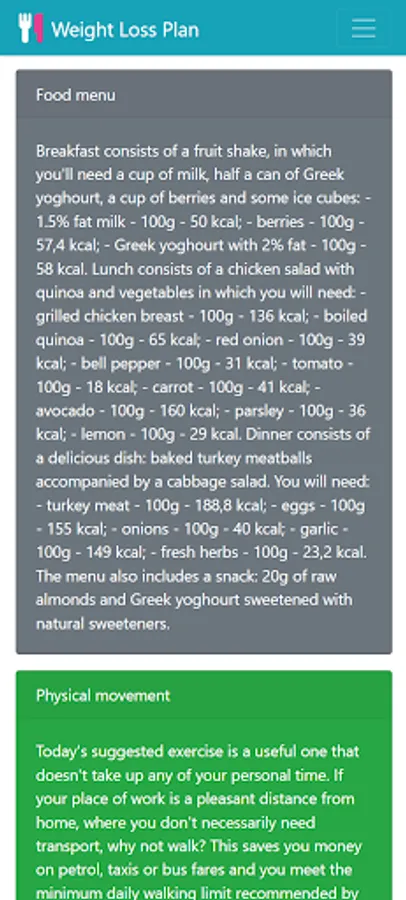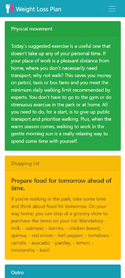 The program is generated by day and includes: food plan, physical exercise, personalized advice, shopping list.