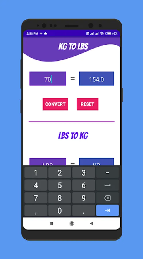 By Using This Application You Can Converts Weight From KG(Kilograms) to LBS(Pounds) and LBS to KG.