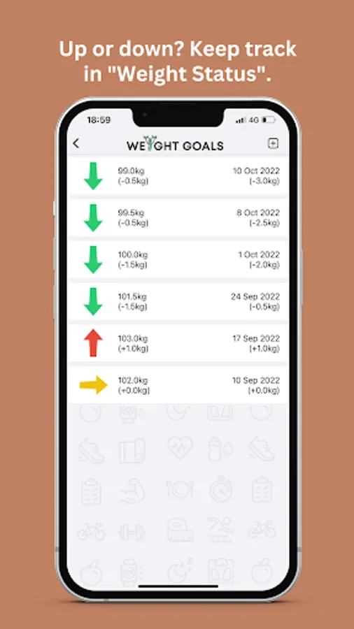 Keep track of your results in kg/lbs., per day, per week and per month (always motivational!)