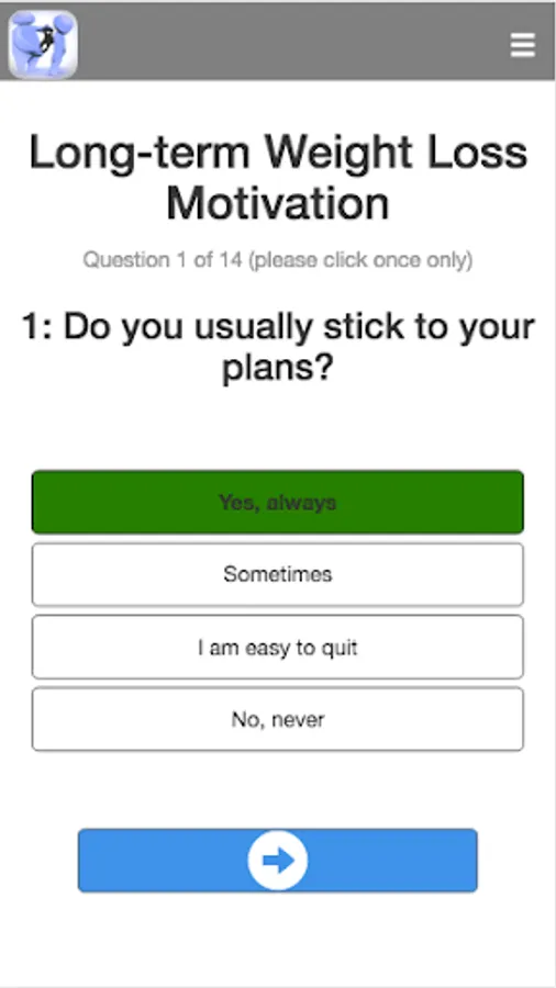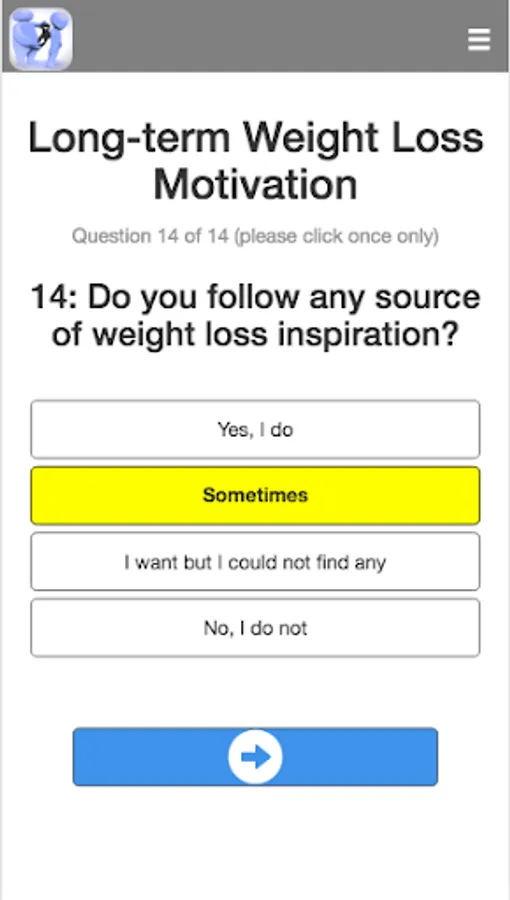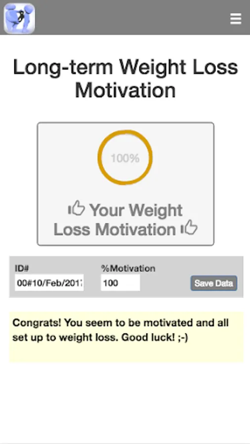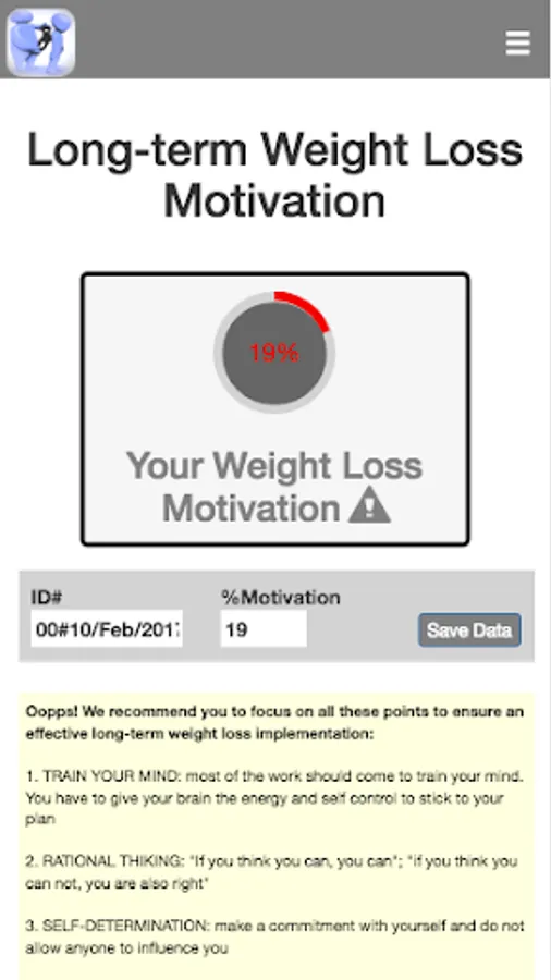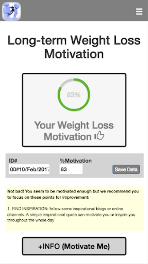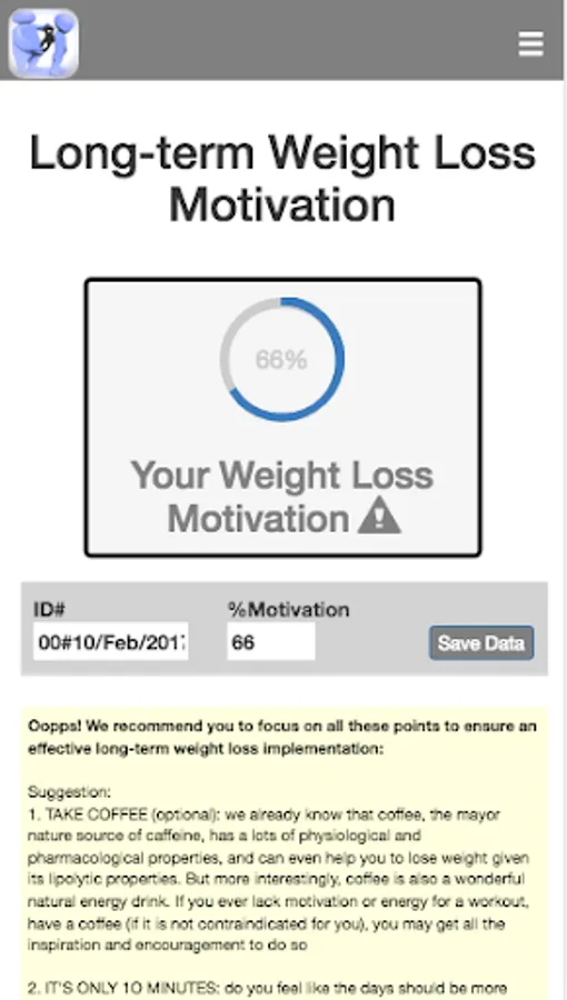 While numerous studies show that ~80% of people are not able to keep weight loss for long-term, likely due to lack of motivation over time, a recent study by Virtual Personal Trainer has clinically and scientifically proven the importance of motivation to achieve to long-lasting weight loss success (https://www.virtual-personaltrainer.com/scientifically-proven/). Given the importance of motivation to effectively implement any weight management program, it would be interesting to evaluate the level of motivation before implementing any strategy. This app evaluate your level motivation and provides you with a list of recommendations in order to boost your motivation and warranty both sort- and long-term weight loss success.