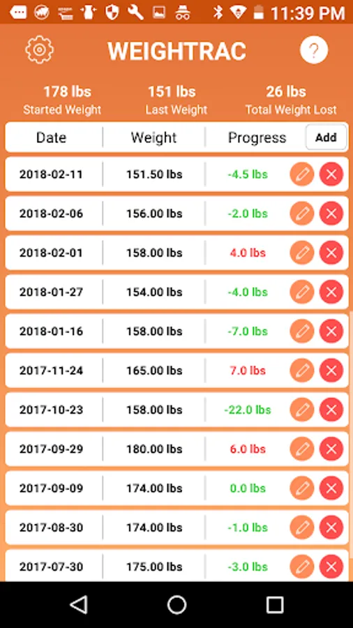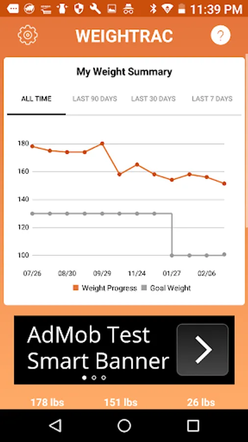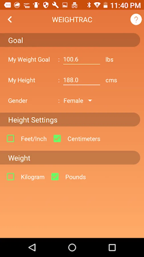 Track your weight loss or gain with ease. View the total amount of weight you have lost or gained since you started tracking your weight. Set a custom target weight goal. Customize your units (pounds or kilograms, feet or centimeters). View a graph of your weight loss or gain progress for the last 7 days, 30 days, 90 days or all time.