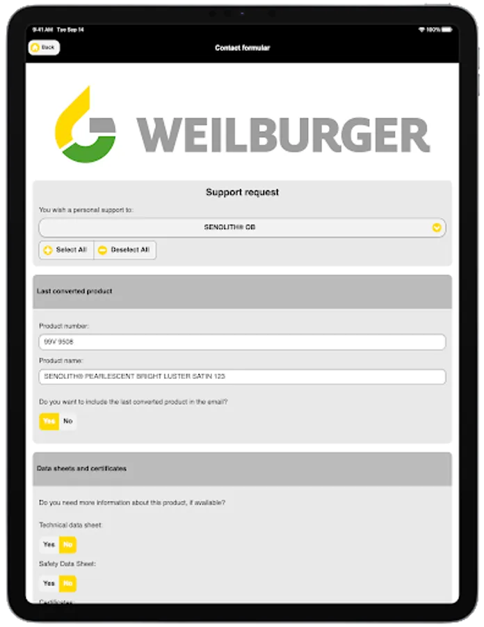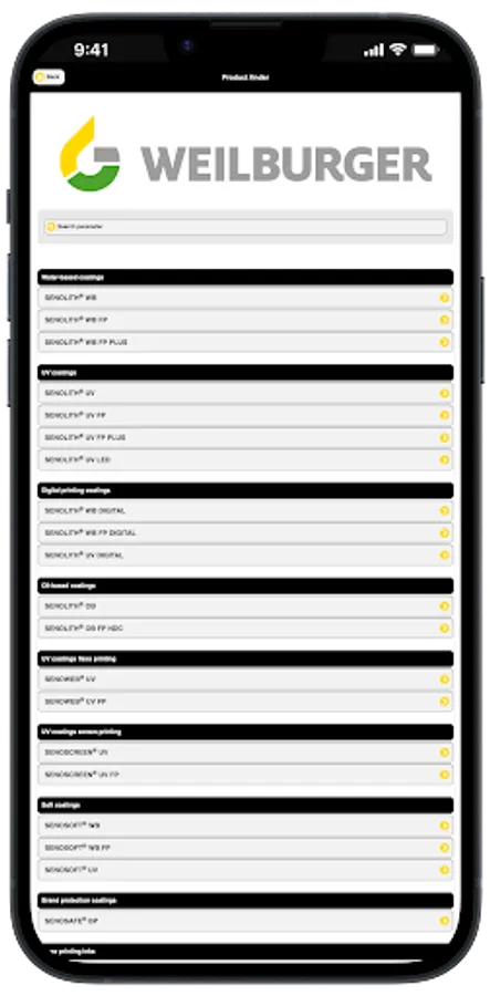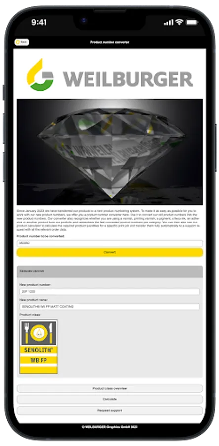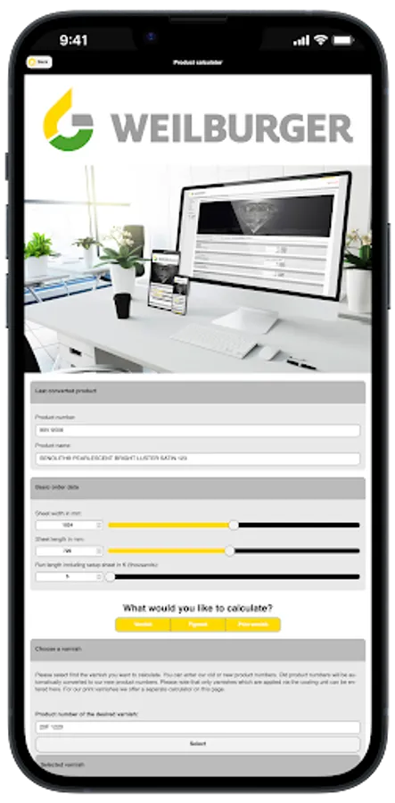 We have also greatly expanded the functional scope of the well-known and popular Weilburger paint quantity calculator for the company and integrated it seamlessly into the new Service App. This means that in addition to varnishes, you can now also comprehensively calculate printing varnishes and even pigments via the app in accordance with your planned production data. In addition, we have even integrated the selection of suitable anilox rollers - depending on the pigment selected - into the new app for the company, making it easier for you to plan production and calculate costs, even for the application of pigmented varnishes. Of course, the app also remembers all job-specific parameters for your print job and then summarizes all the information into a clear support request for you. You can even order the technical data sheets, safety data sheets and certificates for the products at the same time.