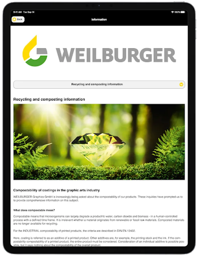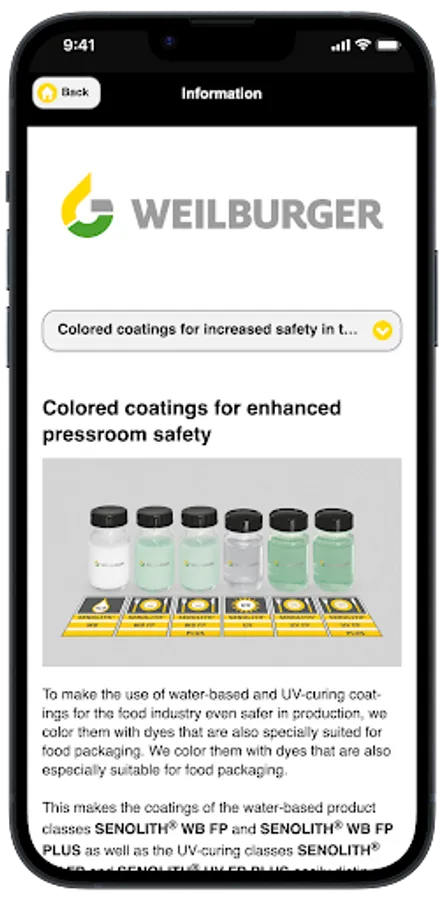 The goal of WEILBURGER Graphics GmbH as your supplier for high-quality coatings, flexo inks and adhesives and your reliable service partner is to offer you the fastest and easiest support per request and order, and the company and we hope that you and your employees will learn to appreciate and love the new WEILBURGER Graphics Service App in daily use.