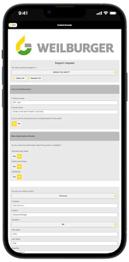 WEILBURGER Graphics GmbH offers you this app to expand its range of services. For this purpose, Weilburger has had the app equipped by us with a very extensive range of functions and has paid attention to maximum benefit in the daily use of their products. The Service App is designed to enable direct contact with the Weilburger sales and service representative responsible for you according to your company location. To do this, simply enter your contact data in the support menu and the app will automatically identify the contact person responsible for you and saves this data. From then on, you can communicate directly with your personal support representative. The company has deliberately avoided cloud-based communication and uses only the local memory of your end device and the GDPR-compliant communication channel via your standard email client. This gives you full control over your communication and you can also find the support requests generated from the app in your mailbox or CRM system at any time.