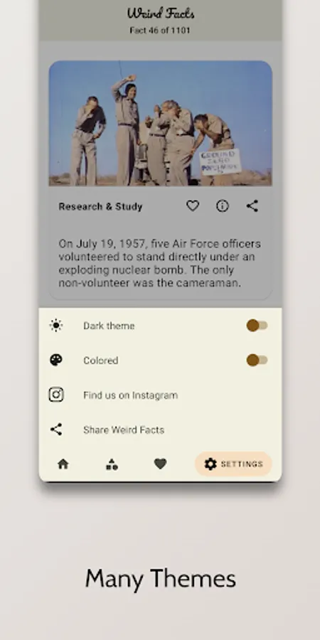 🎉 Features That Impress: "Weird Facts" boasts a clean and intuitive design that welcomes you into the world of curiosity. Bookmark your favorite gems, navigate through categories with a simple swipe, and personalize your experience with different themes.