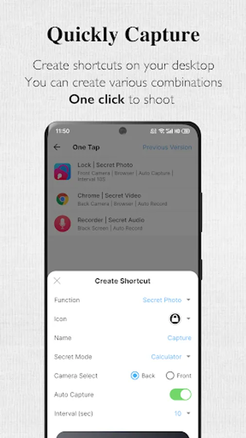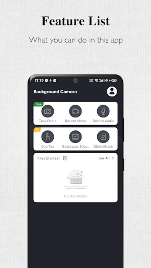 Background Camera is a high-quality background shooting app that allows you to take photos and record videos without previewing them. Whether you are playing games, watching live broadcasts, listening to music, chatting, using other apps, or even if you don’t use your phone (the phone screen is locked), you can take high-quality photos, videos, and audios at any time and anywhere.