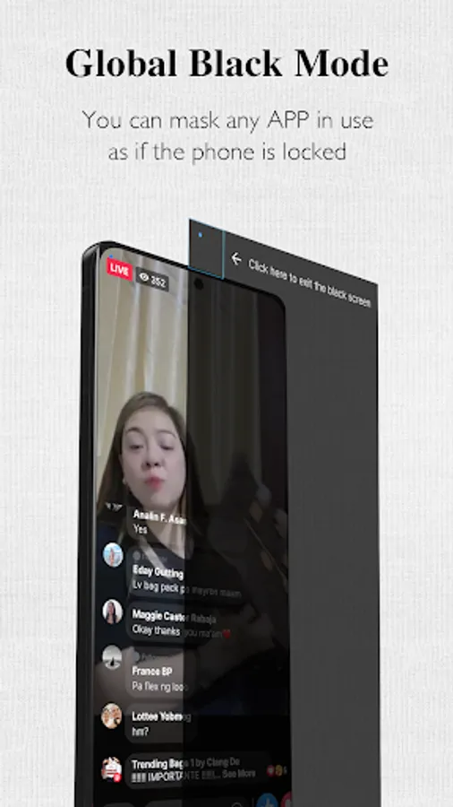 ★ Overlay a global black view on any other app (such as live apps or video chat) to simulate the phone screen being off. The “Force Full Screen” feature requires accessibility permission.