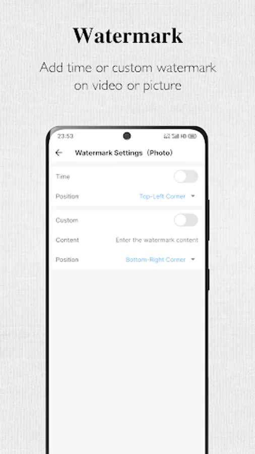 ★ Supported time setting or custom watermark text function. Add watermarks when recording, such as time text or other custom text.