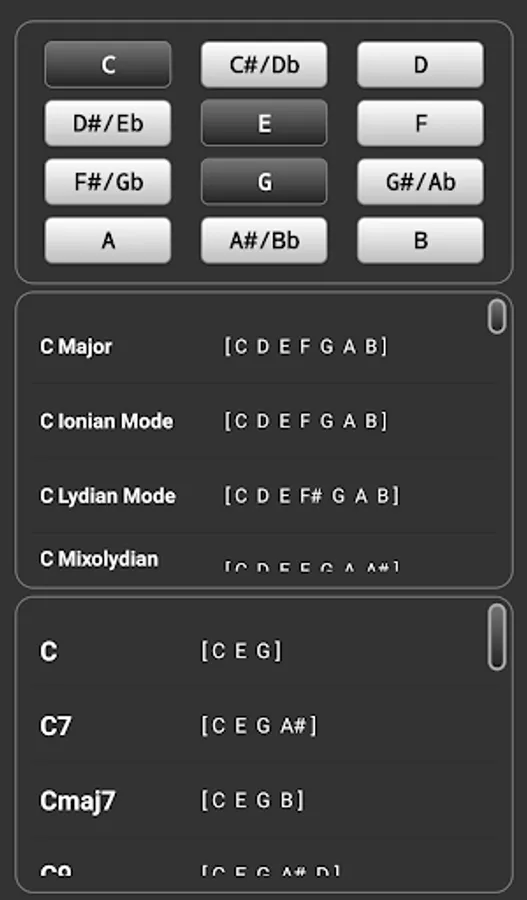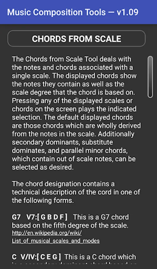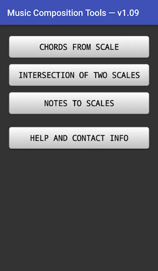 Music Composition Tools is an Android application that simplifies working with musical scales and chords. These tools are suitable for use in music composition, as an educational tool, or just as a form of recreation. Pressing any of the displayed scales or chords on the screen plays the indicated selection. The user can hear the sound of the selected scale or chord without having to know how to play a musical instrument. This allows the novice to quickly gain an insightful understanding into music theory and, perhaps, develop the desire to pursue the subject more formally in future. There are three tools currently provided: Chords from Scale, Intersection of Two Scales, and Notes to Scales.