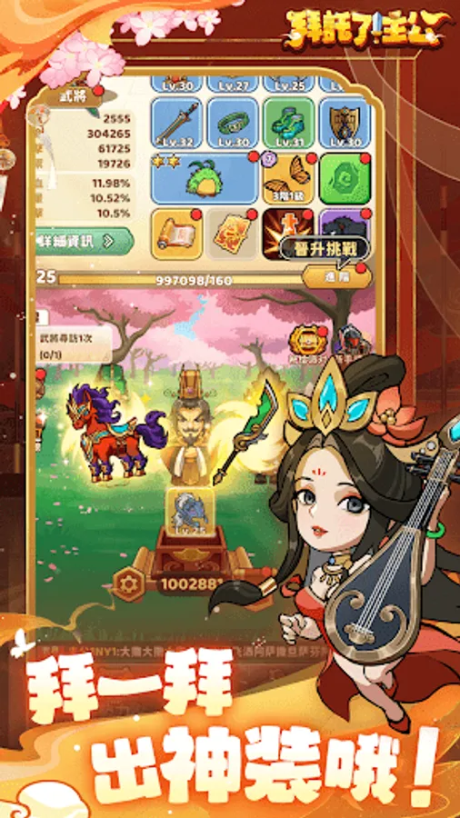 "please! "My Lord" is a mobile game based on the theme of the Three Kingdoms. Players can obtain equipment, props and resources through various interesting ways to create more powerful characters. In the game, you can choose your own genre, such as dodge style, crit style, stun style, etc., and select and strengthen equipment and skills according to your own needs, making your character more unique and powerful.