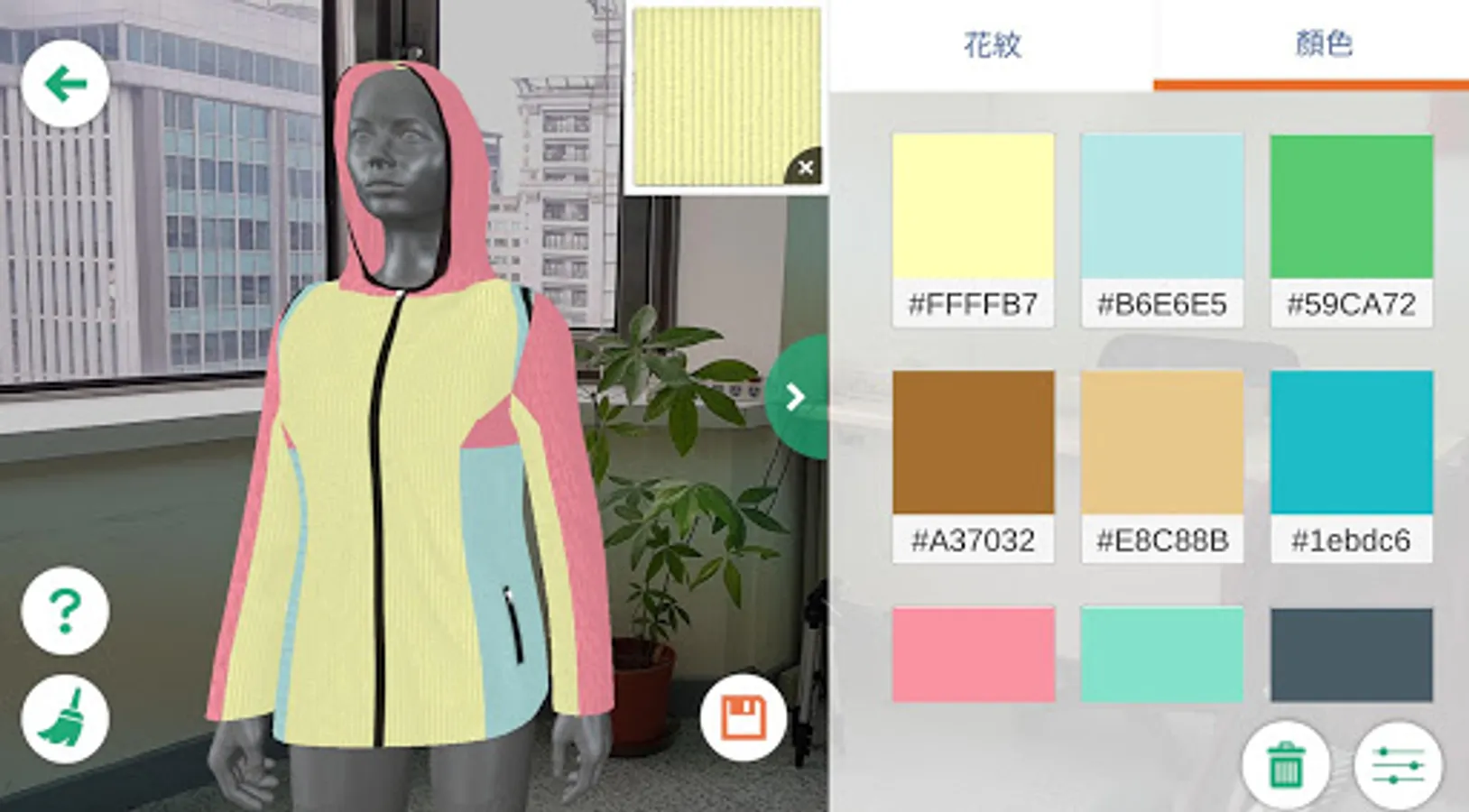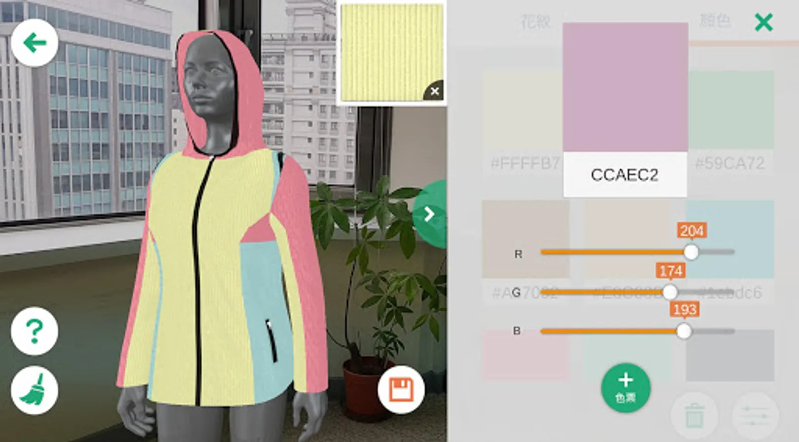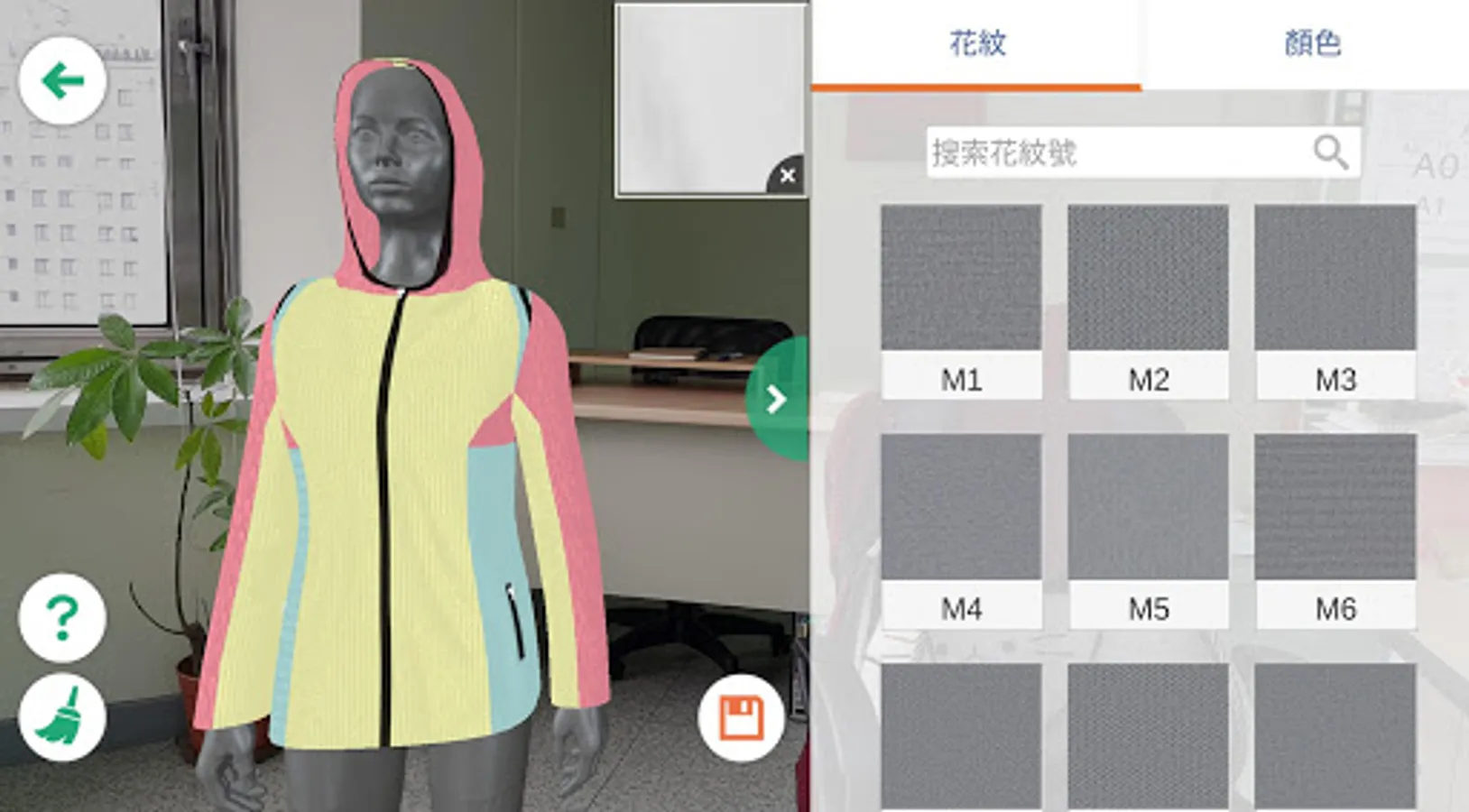 針對款式進行部位編輯,真實模擬服裝花紋、顏色選配效果,將服飾3D化立體成像。掃描布料上的QRcode,將帶出布料的特性、基本相關資料。透過人性化設置且直覺式操作,打造一個設計師與品牌間既簡便實用又互動趣味的有效溝通創作平台。