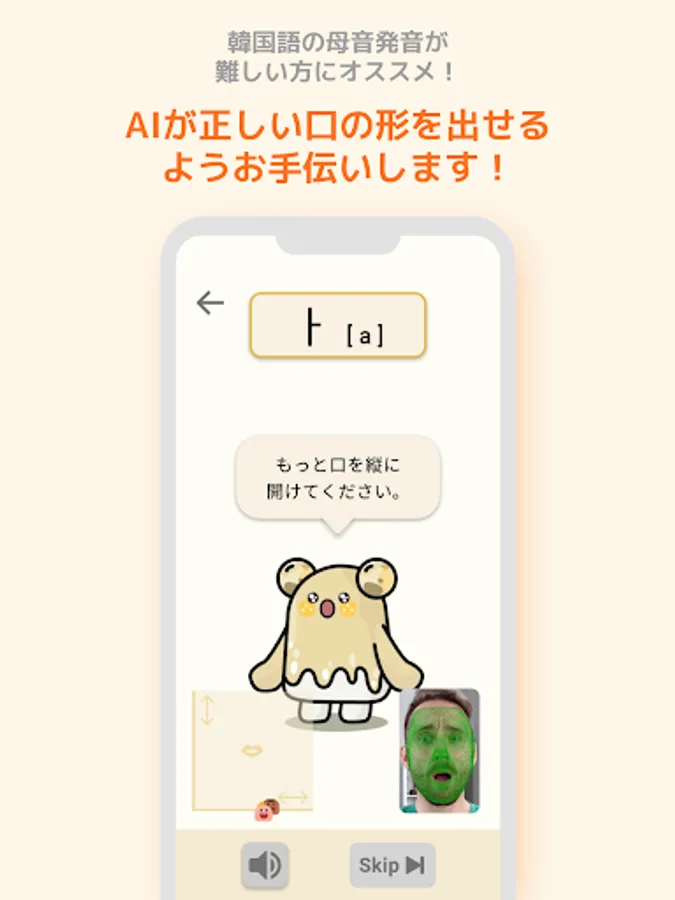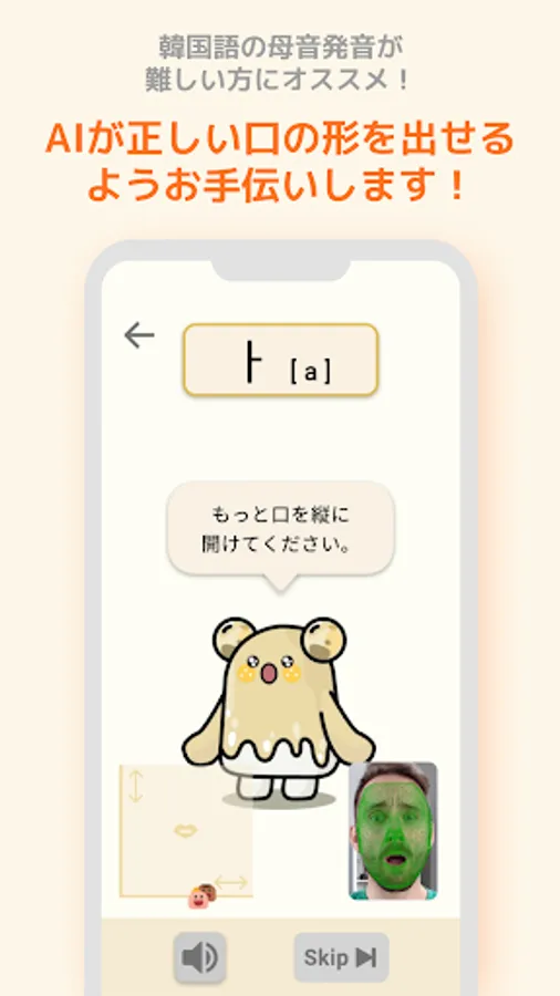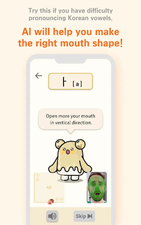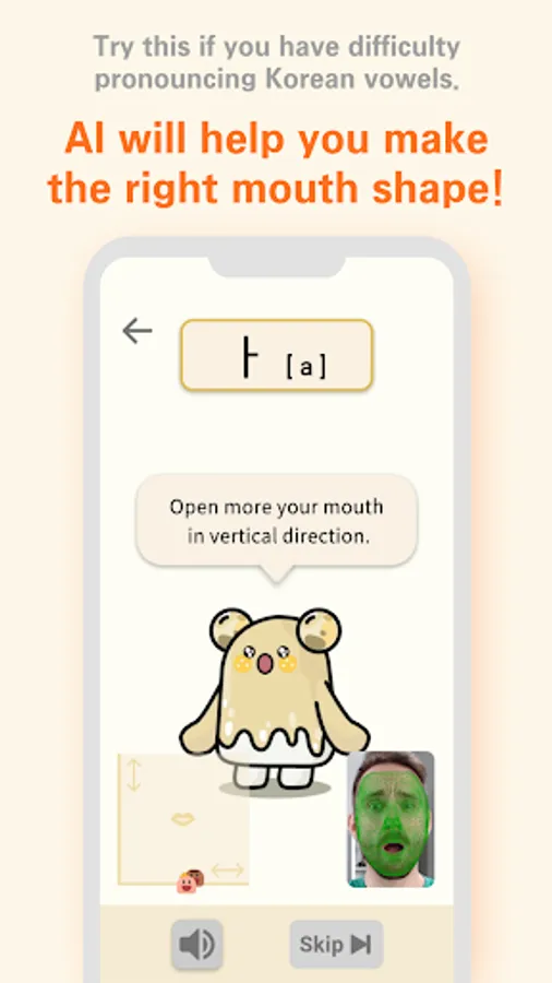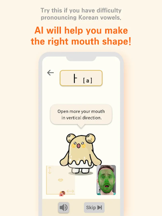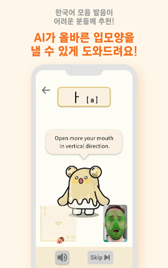 1. 발음교정 화면에서 화면과의 거리가 너무 멀 경우 카메라를 입을 잘 인식하지 못할 수 있습니다.