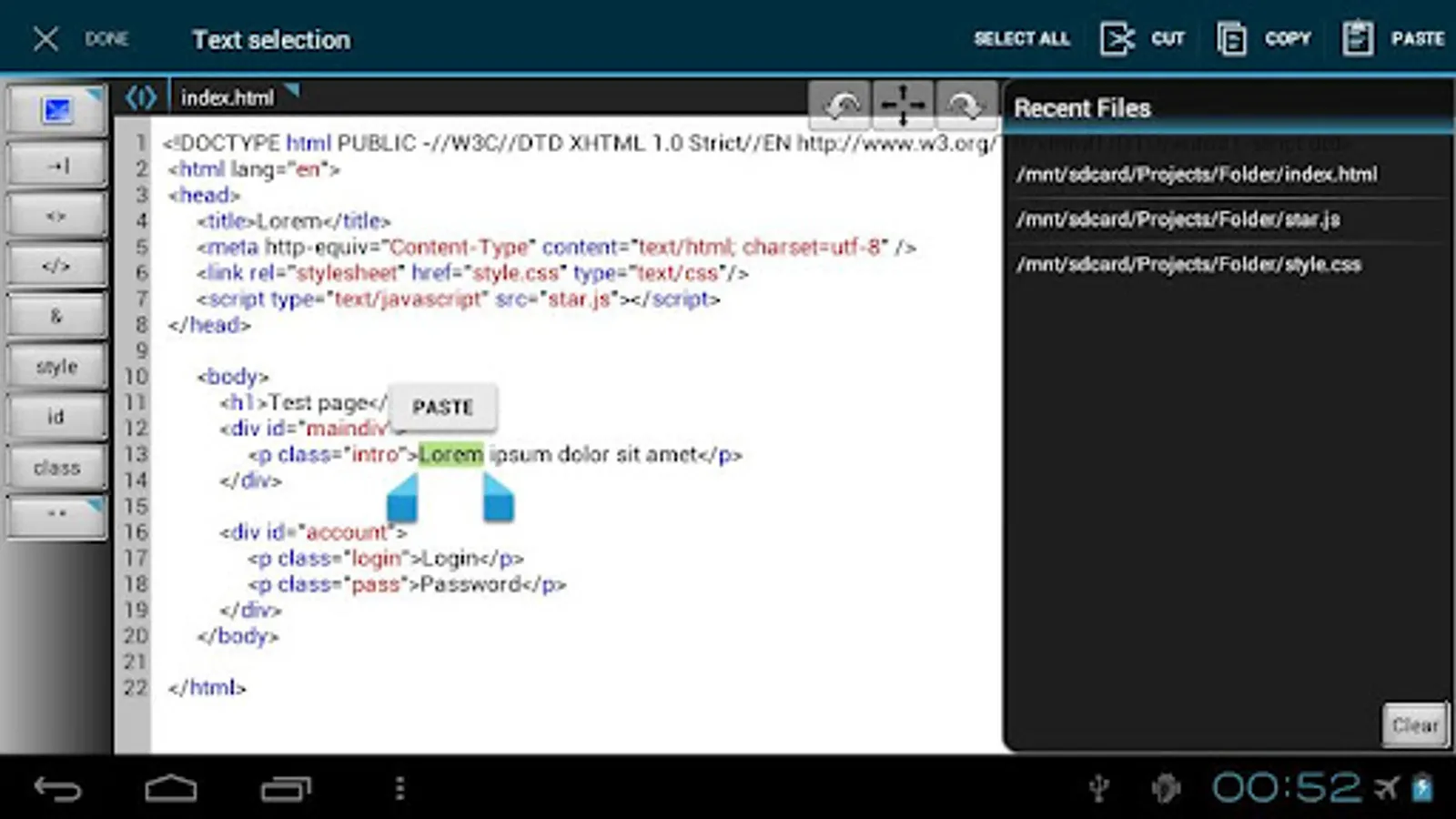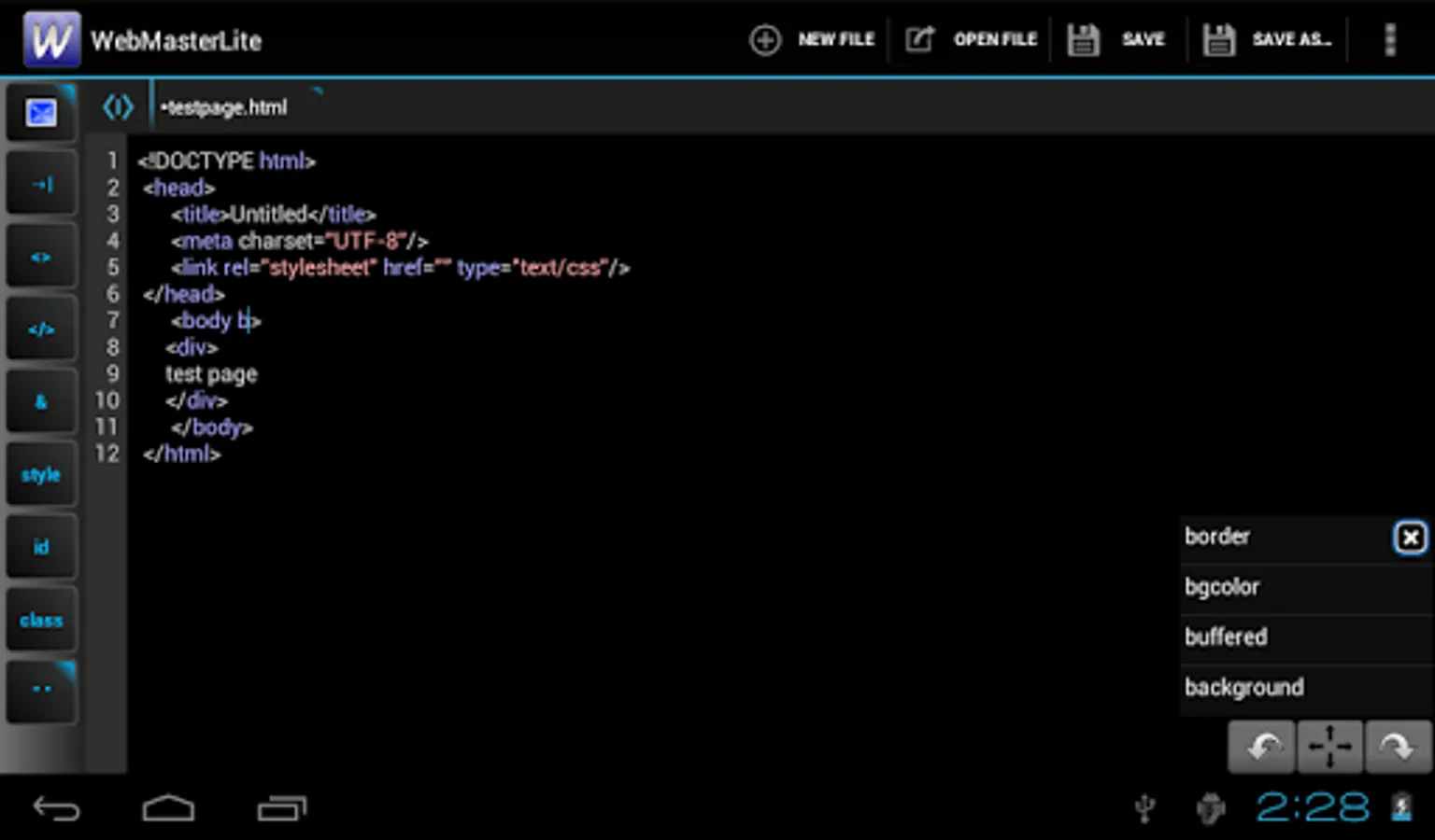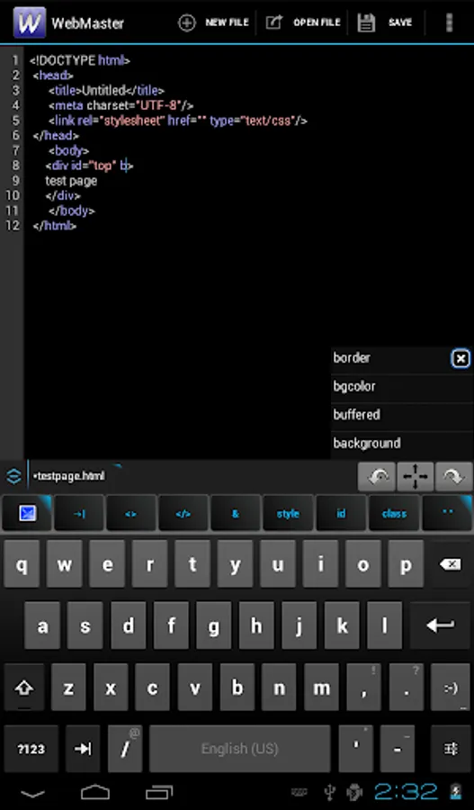 Syntax highlighting and code completion for hypertext files. Our editor supports undo/redo feature, built-in virtual keys for tags and popular key-phrases. Dark and light color schemes available. The program has built-in Help for HTML, JavaScript and CSS syntax.